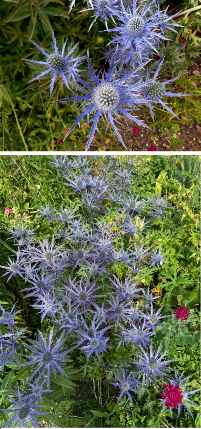 'Sea Holly'. An E. bourgatii hybrid with long lasting colour in the flowers. Looks well with yellow achilleas such as A. 'Gold Plate' or A. 'Martina'.