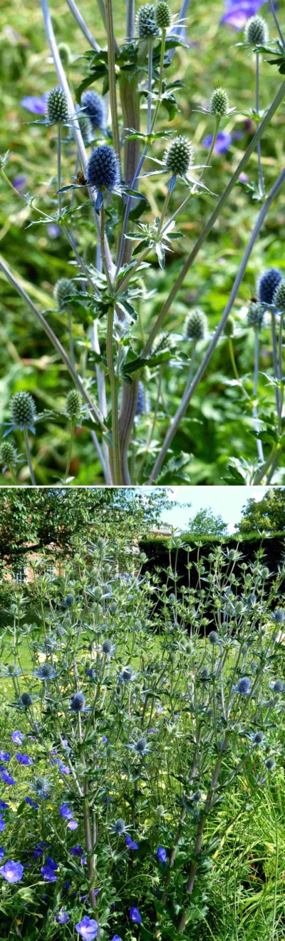 Bright metallic blue flowers up to 75cm (30in) from July to August and growing 45cm (18in) wide. Prefers good, well drained soil in sun.